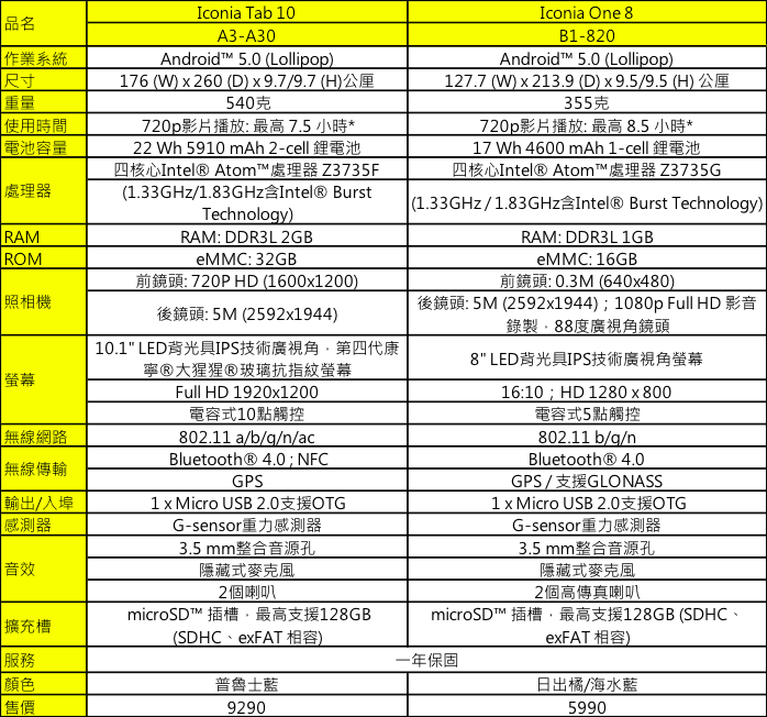 宏碁在台灣推出兩款強化精準觸控功能的平板電腦,分別是 8 吋 Iconia One 8 B1-820 及 10.1 吋 Iconia Tab 10 A3-A30,同樣採用 Android 5.0 作業系統、Intel Atom 四核心處理器,螢幕加入 Zero Air Gap 全貼合技術,配備 Acer Precision Plus 觸控技術、獨家 Iconia Suite 套裝軟體,強調可使用 Acer 2 公厘極細觸控筆或 2 公厘筆尖的鉛筆,進行點擊、書寫或塗鴉。此外,螢幕亦加入濾藍光護眼技術,可降低長時間使用對眼睛造成的不適。Acer Iconia One 8 B1-820 首波推出海水藍、日出橘兩色,售價 5,990 元;Iconia Tab 10 A3-A30 則是普魯士藍,售價 9,290 元,預計 5 月底台灣開賣。