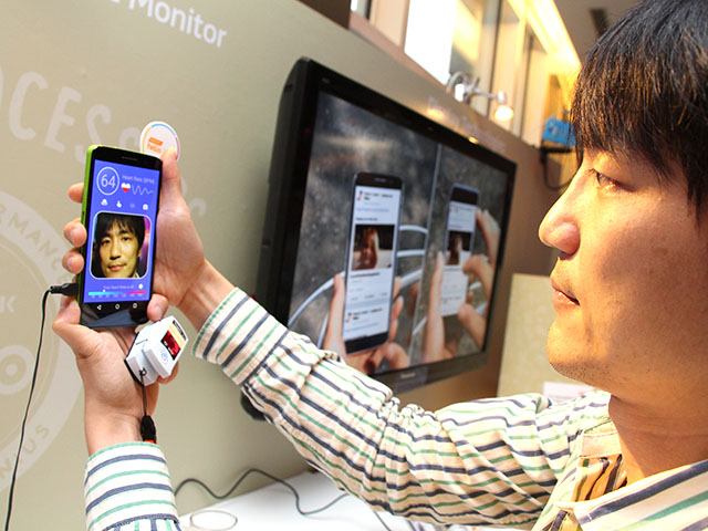 ▲現場人員指出,因心跳所產生的血液循環其實會讓皮膚表面產生變化,雖然人眼無法辨識,但仍可透過手機鏡頭擷取,搭配視覺影像處理,將細部變化轉換成心跳訊號再換算成心律,最後則是以數據的方式呈現上手機畫面。